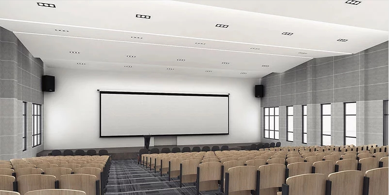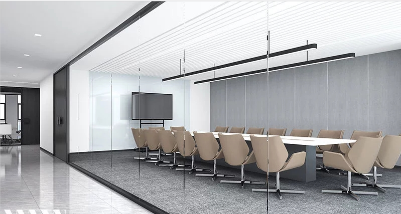 會(huì)議室對(duì)隔音的要求比較高,一般需要從地面、墻體和吊頂三個(gè)方面進(jìn)行設(shè)計(jì)。吊頂一般采用礦棉板吊頂,或者是帶有沖孔的特制吸音吊頂。墻體通常在輕鋼龍骨的空腔中填充吸音棉,然后在龍骨外面安裝隔音板,使其達(dá)到隔音的效果,如果對(duì)隔音要求比較高,可以采用墻面軟包。地面通常選擇鋪設(shè)地毯,因其柔軟多孔,能夠有效地吸收聲音和降低聲音的反射率。